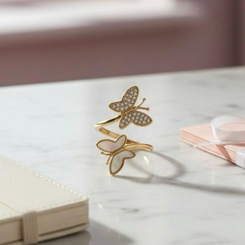 The Ali di Grazia ring is a graceful expression of faith, beauty, and transformation. Designed with an elegant open adjustable silhouette, this piece features two butterfly, one shimmering with pavé cubic zirconia and the other softly polished mother of pearl symbolizing renewal, growth, and divine light.