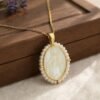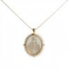 The Ave Maria necklace radiates purity and reverence with its hand-carved depiction of the Virgin Mary, framed in lustrous mother-of-pearl and encircled by a halo of miniature pearls. Crafted in a gold-plated finish, this devotional pendant is both elegant and meaningful, embodying timeless faith and grace.