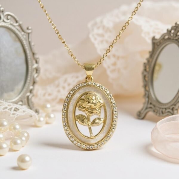 The Luna Rosa Necklace is a romantic fusion of celestial glow and timeless beauty. Framed in an elegant oval of luminous mother-of-pearl and shimmering crystals, it features a golden rose at its heart plated in radiant gold for a touch of everlasting elegance.